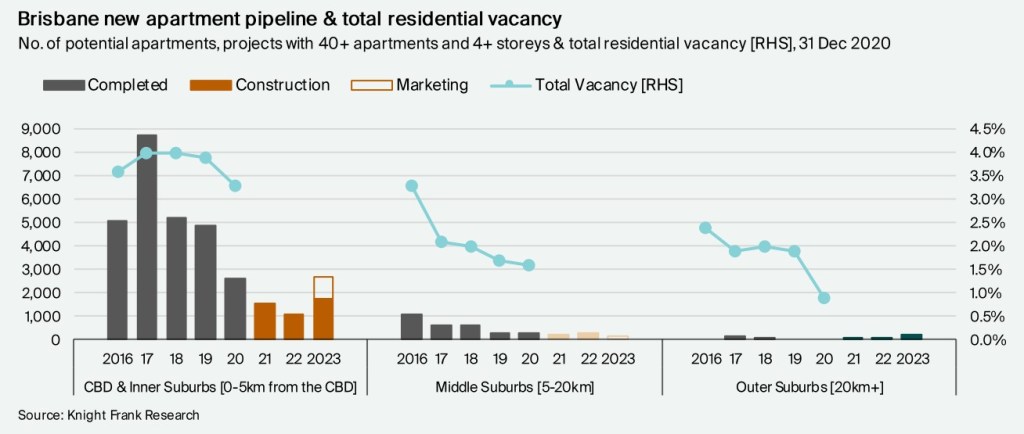 根據 Knight Frank Research 研究顯示,經歷了2017-2019 年公寓市場供過於求,銀行估價低於購買價格,加上2016 年貸款政策改變海外人士無法在四大銀行貸款 (CBA 聯邦銀行, NAB 澳洲國民銀行,ANZ 澳新銀,Westpac 西太平洋銀行 ) , 無法享受與本地人相同的貸款利率,2018年7月上調海外人士印花稅從 3% 漲至 7%,為了打擊炒房且防止房地產泡沫化,投資客紛紛收手;而布里斯本高密度公寓土地銷量則暴跌86% 到 2020 年,布里斯本將在 2024 年完工 6,075 套公寓,這遠遠低於 2018-2020 年的 13,850 套。
